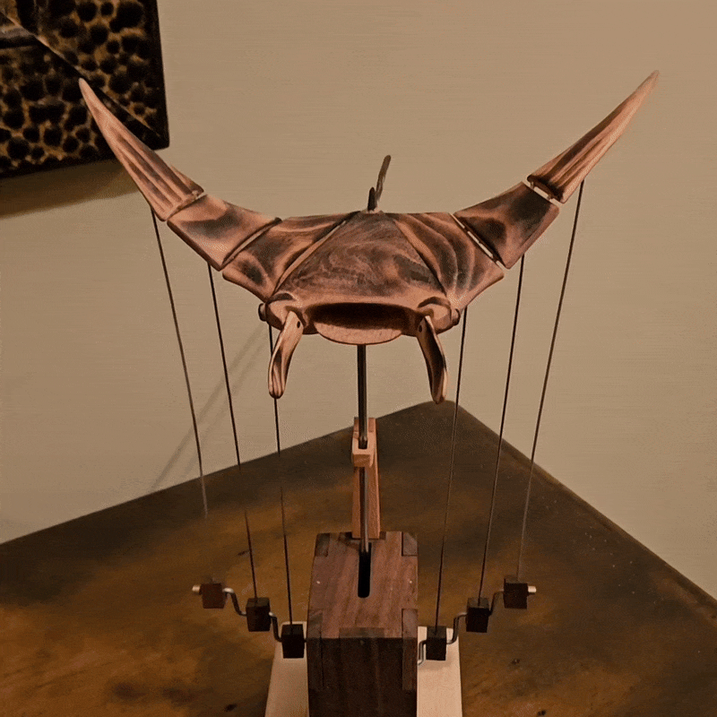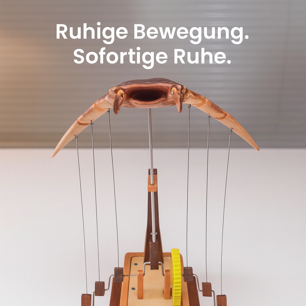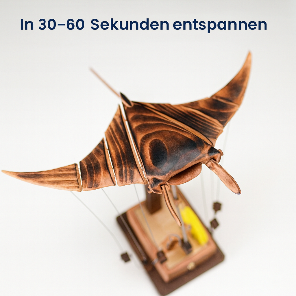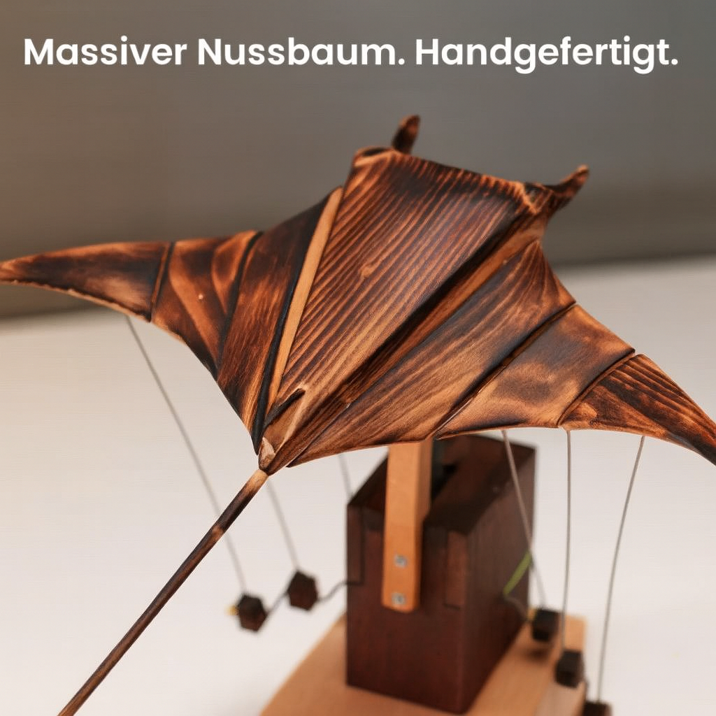 Unter sanfter blauer Beleuchtung erwacht der handgefertigte Mantarochen mit einer ruhigen, fließenden Bewegung zum Leben. Das Licht gleitet über die geschnitzte Holzoberfläche und erzeugt einen faszinierenden, ozeanähnlichen Effekt, der sofort beruhigt und jeden Raum aufwertet.